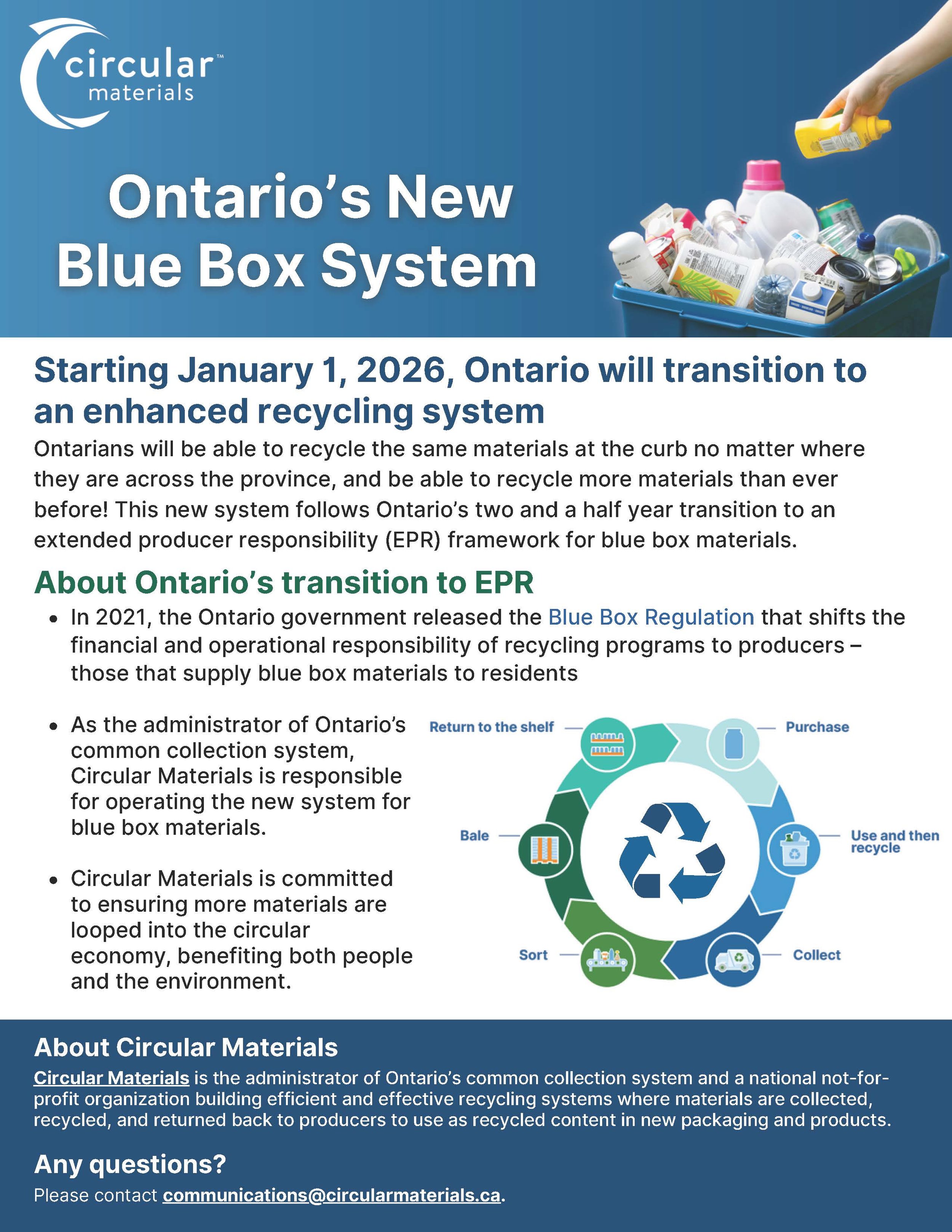 Extended Producer Responsibility came into full force Thursday, January 1, 2026. The City of Toronto will no longer be responsible for curbside recycling collection. Circular Materials, a producer responsibility organization, has assumed control of recycling operations in Ontario.