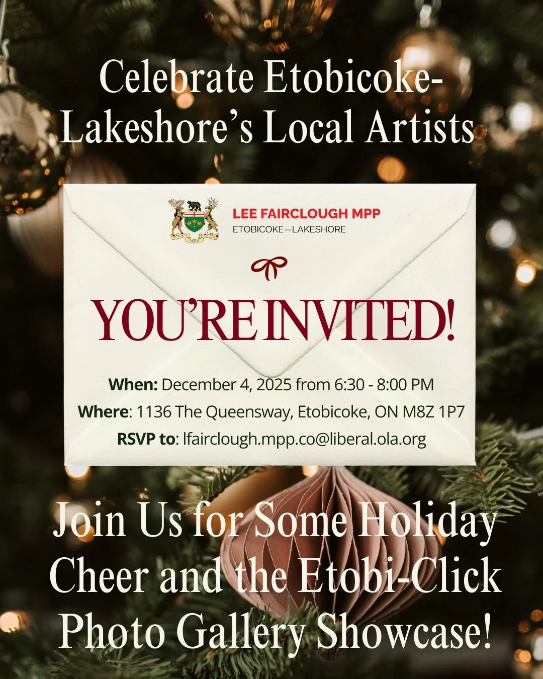 Please note that our Constituency Office is closed from December 22, 2025 until January 5, 2026. If you require immediate assistance over this time, please email us at lfairclough.mpp.co@liberal.ola.org or call us at 416-259-2259.
